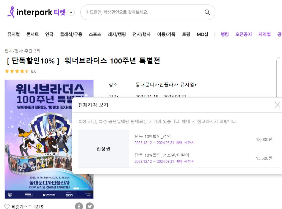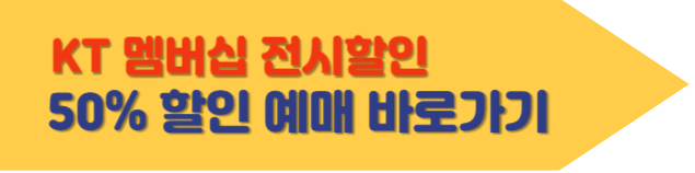 그리고 가장 할인율이 높은 예매 방법은 KT 멤버십 예매입니다. KT 멤버십 포인트로 할인 예매 가능한 공연과 전시 중에서 1월 할인 전시로 ‘워너브라더스 100주년 특별전’이 진행되고 있는데요, 무려 50% 할인으로 된 가격으로 예매가 가능합니다.