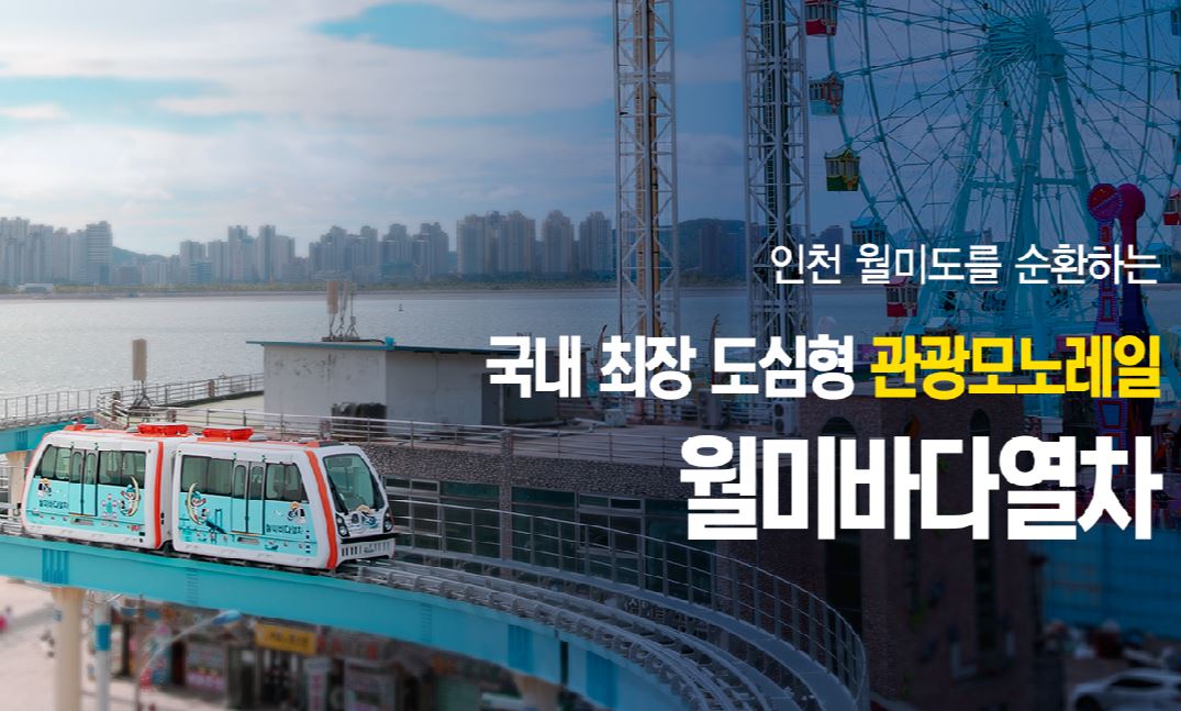 월미 바다열차는 2019년 한국관광공사가 제시한 한국인이 가봐야 할 곳 한국 관광 100선에 선정된 인천 월미도를 순환하는 국내 최장 도심형 관광 모노레일입니다. 총 운행거리는 6.1km이며, 평균 시속 9km의 속도로 월미도를 한 바퀴 도는데 중간역에 하차 없이 한 바퀴를 돌아오는데 걸리는 시간은 약 42분 정도 소요됩니다.