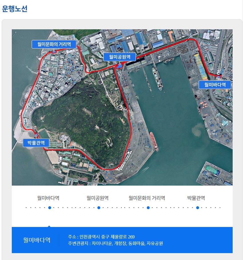 이용 가능한 역은 총 4개의 역으로 월미 바다 역, 월미 공원 역, 월미 문화의 거리 역, 박물관 역이 있고, 박물관 역을 지나면 다시 월미 공원 역으로 순환하여 월미 바다역으로 들어오는 노선으로 운행하고 있습니다. 월미 공원 역부터는 돌아서 제자리로 오는 코스이므로 중간에 잘못 내렸거나 해도 전혀 걱정하실 필요가 없습니다.