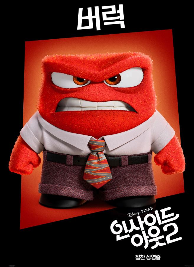 - 버럭(Anger) - 이름처럼 버럭 하는 성격. 다른 이름으로는 분노라고 불리기도 한다. 기쁨의 설명으로는 일이 공정하지 못한 것에 깊게 관여하는 역할이다.