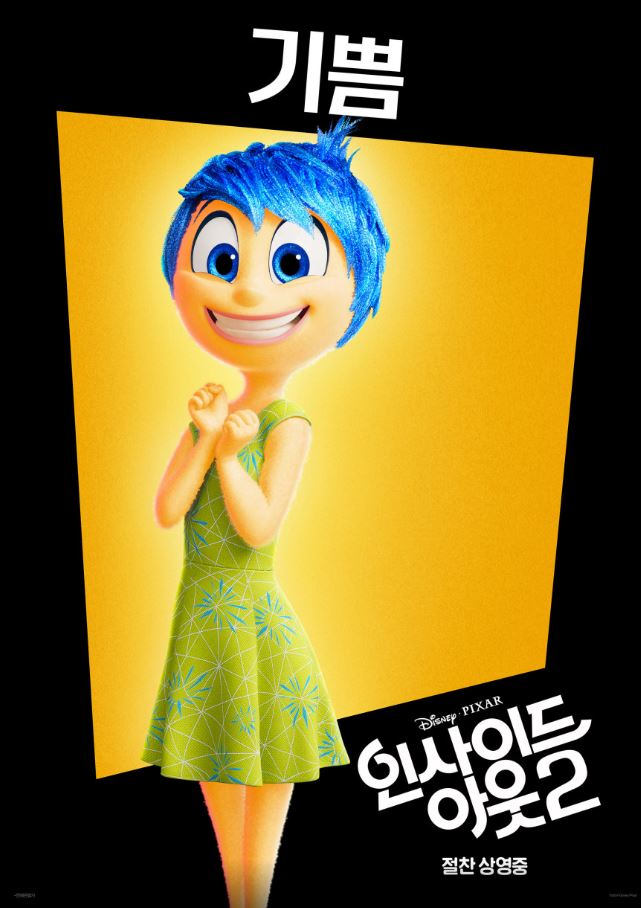 - 기쁨(Joy) - 인사이드 아웃 시리즈의 주인공이다. 라일리 앤더슨의 감정 중 가장 먼저 생겨난 감정으로서 감정 컨트롤 본부의 리더를 맡고 있으며, 담당하는 분야는 당연히 기쁨, 긍정적인 사고, 욕망 충족이다.