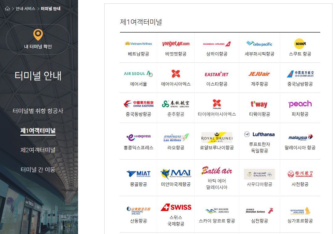 위에 안내된 내 터미널 찾기 링크에서도 여객터미널 별 항공사 조회가 가능하니 살펴보시면 됩니다.
