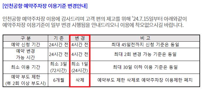 예약 신청과 예약 변경은 4시간 전까지 가능하며, 변경은 최대 2회까지 할 수 있습니다. 예약 완료 후 예약 조회 및 변경 또는 취소 시 아래 링크에서 가능하니 일정이 변경되어 예약된 주차장 이용이 어려운 경우에는 예약 내용을 변경하면 됩니다. 예약 주차장 최소 이용 기간은 1일이고 이 내용은 2024년 7월 15일부터 변경 적용되는 내용이니 참고하시기 바랍니다.