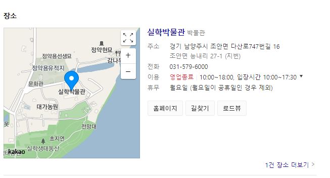 실학 박물관은 정약용 유적지 바로 앞에 위치하고 있고, 주소는 경기도 남양주시 조안면 다산로 747번길 16입니다. 전화번호는 031-579-6000입니다.