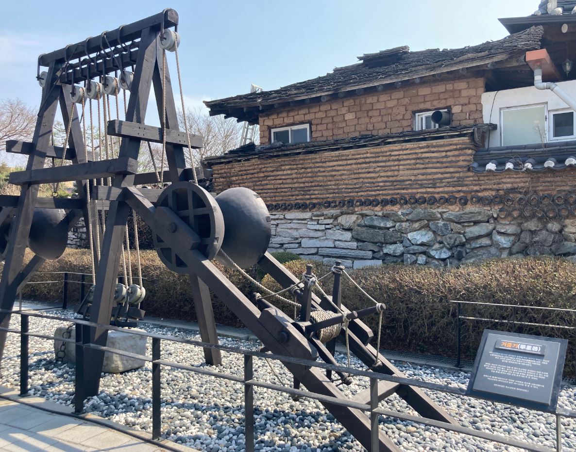 정약용 유적지는 외부 시설과 내부 시설로 나누어집니다. 먼저 외부 시설에는 천일각과 기념탑이 입구에 자리 잡고 있습니다. 그리고 꺼지지 않는 불을 의미한다는 조형물이 있고, 정문 쪽 맞은편에 정약용 선생을 떠올리면 빼놓을 수 없는 거중기가 설치되어 있습니다.