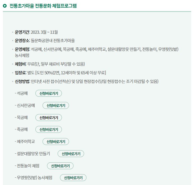 3코스 전통 초가마을에서는 다양한 전통문화 체험 프로그램이 있습니다. 현재 안내되고 있는 프로그램은 23년 3월부터 11월까지 운영되고 있으며, 석공예, 신서란 공예, 목공예, 죽공예, 제주어학교, 설문대할망 옷 만들기, 전통놀이, 우영팟 농사체험 등이 있습니다. 체험비는 무료이고 인터넷 사전 접수와 당일 현장 접수 모두 가능합니다.