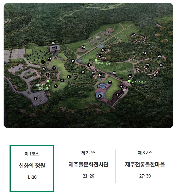 제주 돌문화공원은 공원 전체가 3자기 코스로 나누어져 있습니다. 먼저 제1코스는 [신화의 정원]이라는 테마로 돌 박물관, 오백 장군 갤러리, 어머니의 방으로 이루어져 있고 입구에서 시작되는 좌우 코스로 이루어져 있습니다. 도보로 이동 시 약 1시간이 소요되며 이동거리는 1300m로 공원 전체 이동이 어려울 경우 가장 많이 선택하시는 관람 코스입니다.