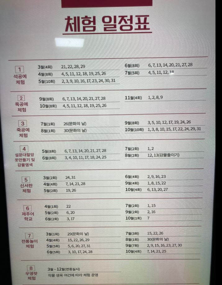 저는 아이와 석공예 체험과 4월 행사 체험인 현무암 미니정원 만들기 체험을 했는데 아이도 저도 너무 만족스러운 시간이었습니다. 석공예 체험은 앞으로 돌 문화공원에 세울 돌하르방을 직접 조각해 보는 것인데 선생님들께서 너무 친절하게 도와주셔서 아이도 너무 좋아했습니다. 현무암 미니정원은 현무암 사이에 다육식물을 심는 것인데 비행기에 조심히 가지고 와서 집에서 잘 자라고 있어서 볼 때마다 추억을 떠올리기도 합니다.