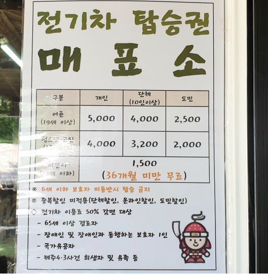 앞서 안내 드렸듯이 돌 문화공원은 생각보다 더 넓어서 거동이 불편하신 어른들이나 어린아이들이 오래 걷기 힘들 수도 있습니다. 그래서 내부에는 전기 힐링 차가 유료로 운행 중입니다. 이용요금은 19세 이상 성인은 5,000원 13세 이상 청소년은 4,000원 12세 이하 어린이는 1,500원입니다. 65세 이상 경로자와 장애인, 유공자는 50% 할인 이용이 가능합니다.