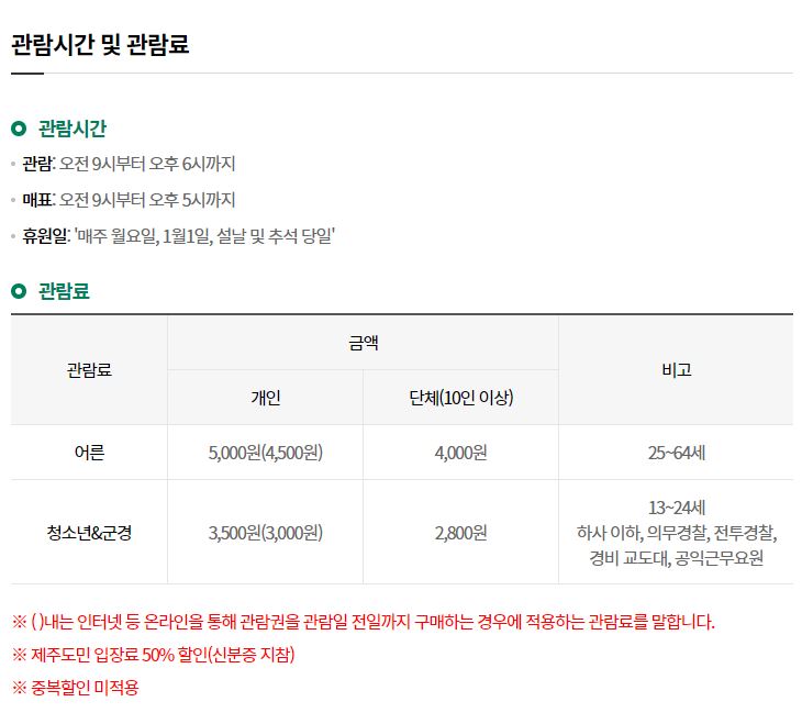 관람요금은 25세부터 64세까지 어른은 5,000원이고, 13세부터 24세까지 청소년과 군경은 3,500원의 요금이 적용됩니다. 만 12세 이하의 어린이와 만 65세 이상의 경로자의 경우는 전액 무료 관람이 가능합니다. 초등학생까지의 자녀들과 부모님들과 방문하시는 분들은 연령을 확인하셔서 꼭 무료입장 혜택을 받으시기 바랍니다.