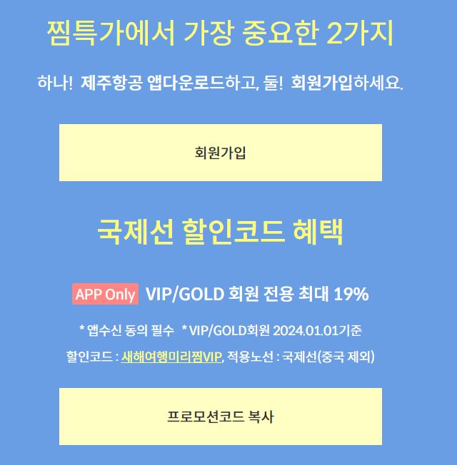 두 번째, 모바일 앱으로 항공권 구매 시 할인코드를 제공합니다. 제주항공 앱을 다운로드하고 모바일 앱으로 항공권을 구매할 경우 회원 등급에 따라서 최대 19%의 할인코드를 제공합니다. 신규 회원 가입자는 국내선 7%, 국제선 5%의 중복 할인도 받을 수 있습니다.