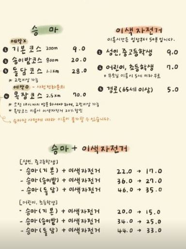 승마체험은 기본 코스(200m) 9,000원, 송이밭 코스(800m) 20,000원, 돌담 코스(1.1km) 28,000원이며 사전예약은 불가능하니 방문하셔서 선택하시고 체험하셔야 합니다. 별도로 목장 코스(2.5km)는 70,000원으로 2인 이상 가능하고 사전에 전화로 문의하셔서 예약을 하셔야 하는데, 목장 코스는 오전 10시까지 방문 시 이용이 가능하고, 이색자전거 이용 20% 할인 혜택도 있다고 하니 참고하시기 바랍니다.