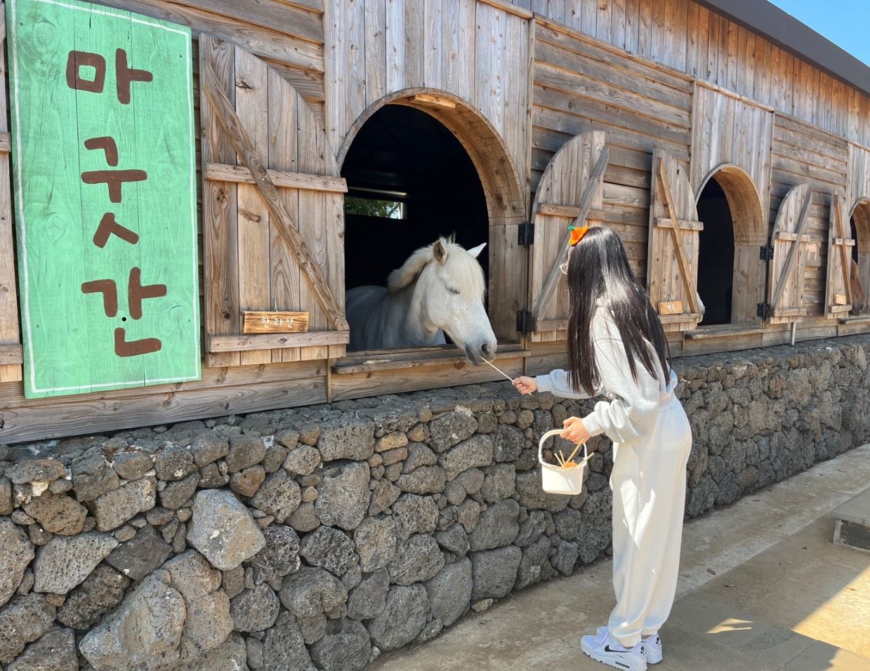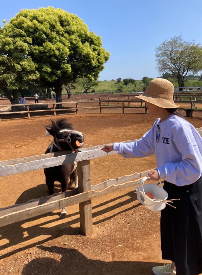 말먹이주기 체험의 경우 바구니에 담긴 말먹이를 구매하면 체험이 가능합니다. 말먹이는 한바구니에 5,000원으로 카페 또는 승마장에서 구매 가능하고, 한 바구니에 당근 꼬치가 10개 들어 있습니다. 긴 꼬치에 당근이 꽂혀 있어서 어린아이도 먹이 주기가 편하고 쉽게 되어 있어서 저희 가족은 바구니를 2개 이용했습니다. 아이가 있으신 분들이라면 꼭 추천하고 싶습니다.