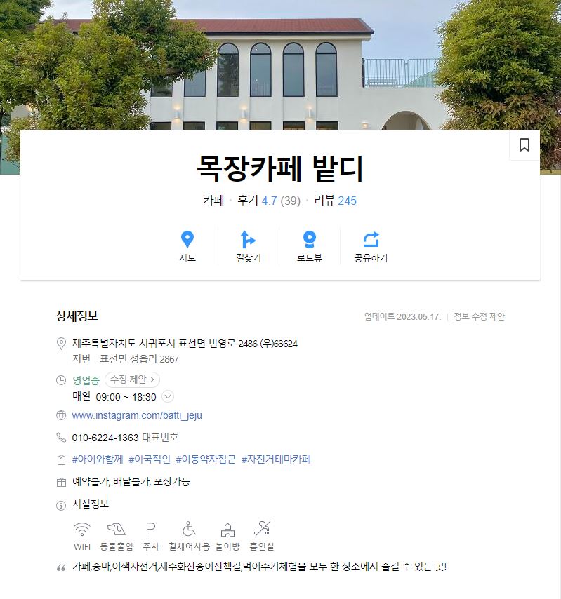 목장 카페 밭디는 한라산을 기준으로 오른쪽 제주 동부에 위치하고 있습니다. 상세주소는 제주특별자치도 서귀포시 표선면 번영로 2486이고 구 주소는 표선면 성읍리 2867입니다. 제주에서는 보통 승마체험이 있는 곳이 작은 길로 찾아가야 하거나 외진 곳에 있는 경우가 있는데 이곳은 새로 개장한지 얼마 되지 않은 곳으로 표선에서 제주시로 나가는 큰 길가에 위치하고 있어서 찾기도 쉽고 여행 동선을 짜는데도 어렵지 않은 곳입니다.