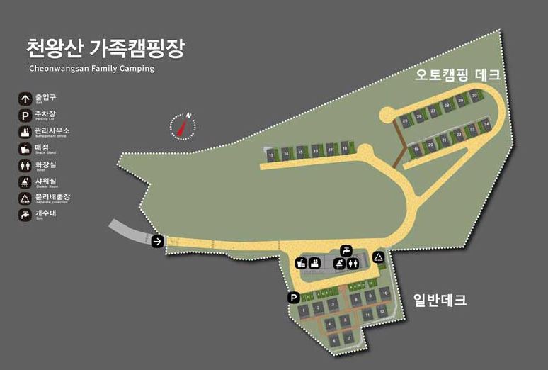 천왕산 가족 캠핑장은 일반 데크 구역과 오토캠핑 테크 구역으로 나누어집니다. 일반 데크 구역은 12면으로 이루어져 있고, 피크닉 테이블이 설치되어 있으며 전기 사용이 가능합니다. 주차는 일반 데크 사이트가 조성되어 있는 구역 앞쪽으로 별도 주차 가능합니다.