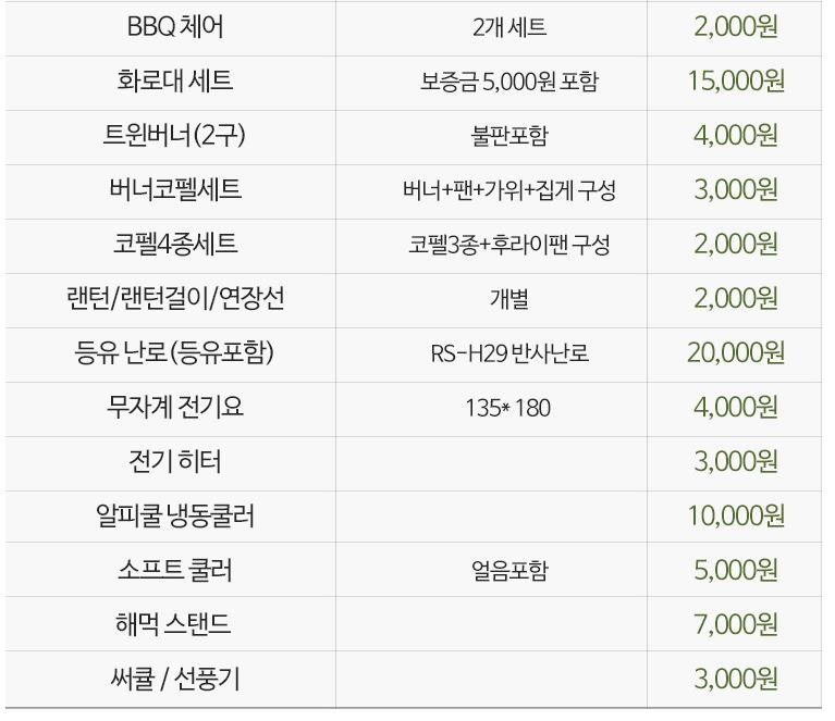 특히 이곳은 장비가 없으신 분들도 캠핑을 즐길 수 있도록 사전에 미리 예약하면 텐트와 타프 등을 미리 설치해 주셔서 이용이 가능하고, 그 외에 여러 다양한 물품들이 모두 대여가 가능해서 이용에 부담이 없습니다.