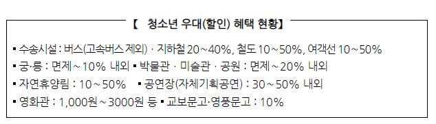 전체 청소년 우대 현황은 여성가족부 누리집(www.mogef.go.kr) 알림 소식 게시판을 참고해 보시기 바랍니다.