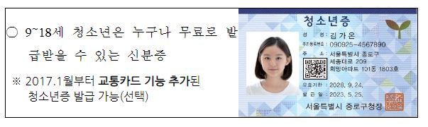한국의 청소년 대다수가 학교를 다니고 있으므로 중,고등학생의 경우는 학생증이 있지만, 학교를 다니지 않는 비 학생 청소년과 9세 이상의 초등학생들은 금융거래나 신분확인 시 증명이 어려워 불편한 경우가 있는데 청소년증을 발급받으면 유용하게 사용이 가능합니다