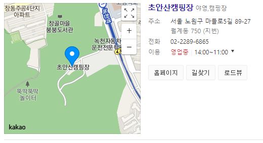 초안산 캠핑장은 노원구에 위치한 캠핑장으로 주소는 서울시 노원구 마들로 5가 길 66-107입니다. 연락처는 02-2289-6865입니다. 지하철 1호선 녹천역 4번 출구 녹천 자동차 학원 바로 뒤에 위치하고 있어서 서울시에서 지하철 이용 후 도보로 이동 가능한 흔하지 않은 역세권 캠핑장입니다. 그리고 간선버스 102번과 지선버스 1119번 이용이 가능하여 대중교통 이용이 편리한 장점이 있습니다.