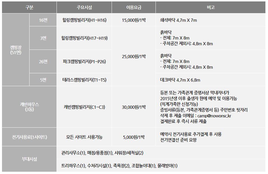 캐빈하우스는 1박에 30,000원에 이용이 가능하며, 가족관계 증명서상 막내 자녀가 2015년생 이후 출생자에 한하여 예약이 가능합니다. 그 외 모든 사이트의 전기 사용료는 1박에 5,000원이 추가되니 참고하시기 바랍니다.