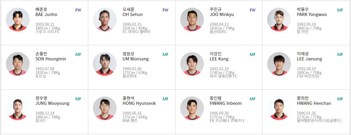 MF | 박용우(알 아인), 정우영(알 칼리즈), 황인범(FK 츠르베나즈베즈다), 홍현서(KAA 헨트), 배준호(스토크 시티) 이재성(마인츠), 손흥민(토트넘), 황희찬(울버햄튼), 엄원상(울산HD), 이강인(파리 생제르맹) |
