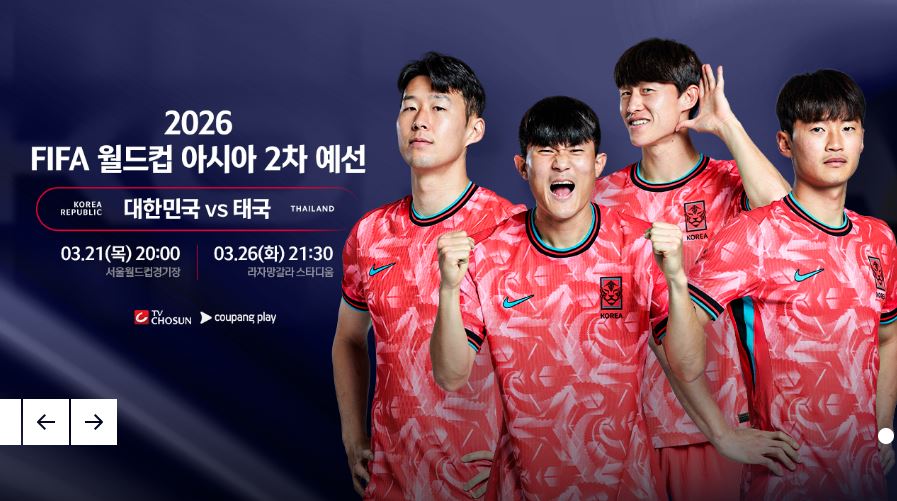 여러 가지 이유로 경기장을 직접 찾지 못하시는 분들은 경기 중계를 볼 수 있는 방법을 궁금해하시는데요, 3월 21일 서울월드컵 경기장에서 열리는 태국과의 홈경기는 TV조선과 쿠팡플레이서 중계된다고 합니다. 아래 링크로 가시면 중계 채널로 바로 가실 수 있는 안내가 되어 있으니 참고하시기 바랍니다.
