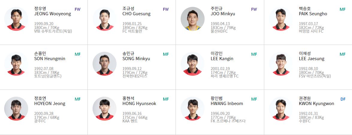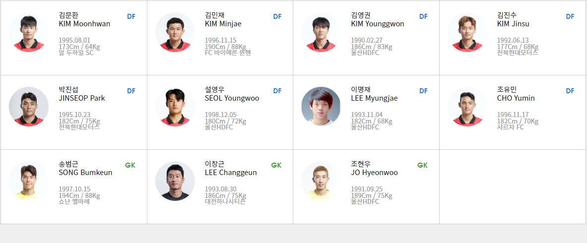 - GK : 송범근(쇼난벨마레), 이창근(대전하나시티즌), 조현우(울산HD)