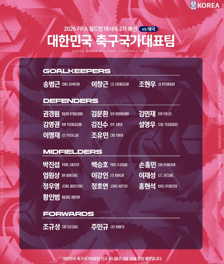 2026 FIFA 북중미 월드컵 2차 예선 태국과의 경기가 코앞으로 다가왔습니다. 많은 분들이 오랜만에 축구 국가대표팀 선수들의 경기를 볼 수 있다는 생각에 기다리고 계실 텐데요, 대한축구협회(KFA)는 3월에 열리는 태국과의 2연전에 나설 남자 축구 국가대표팀 23명의 명단을 지난 3월 11일 발표했습니다. 아시다시피 황선홍 임시 감독 체제에서 변화된 대표팀 명단을 궁금해하시는 분들이 많아서 오늘은 23명의 선수명단과 확정된 코칭스태프 명단 그리고 태국과의 경기일정까지 알아보겠습니다.