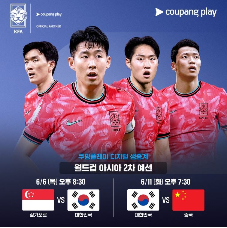 쿠팡 플레이는 6일 밤 9시 싱가포르 원정과 11 밤 8시 중국과의 홈경기를 경기 시작 30분 전부터 생중계합니다. 이번 월드컵 예선 경기의 중계에는 이근호 해설 위원과 한준희 해설 위원이 해설을 맡아주고, 1차전 싱가포르 경기는 윤장현 캐스터가, 그리고 2차전 중국전은 배성재 캐스터가 함께 할 예정이라고 합니다.
