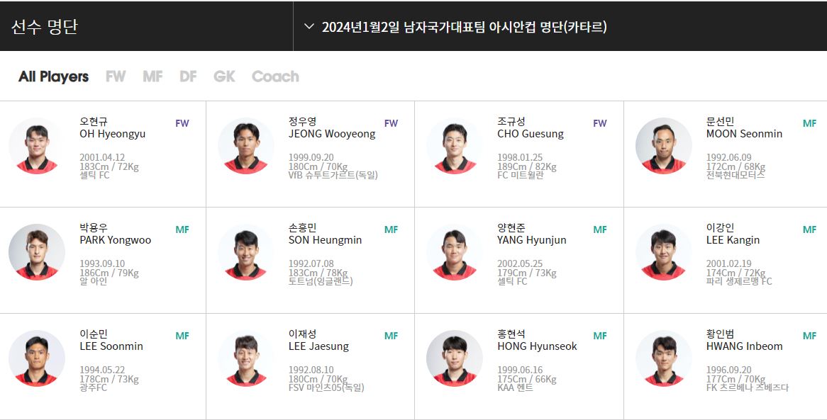 3. 카타르 아시안컵 축구 국가대표팀 최종 명단