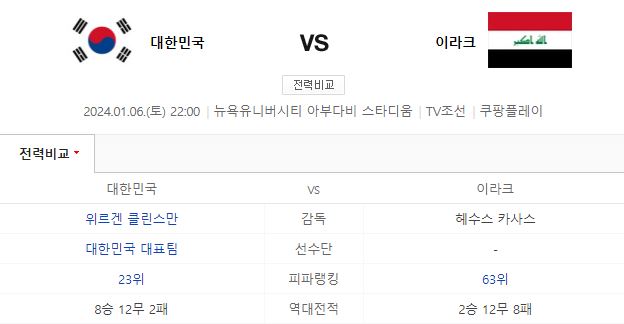 - 대한민국 VS 이라크 : 2023년 1월 6일 오후 10시(한국시간) / UAE 아부다비 뉴욕대 스타디움