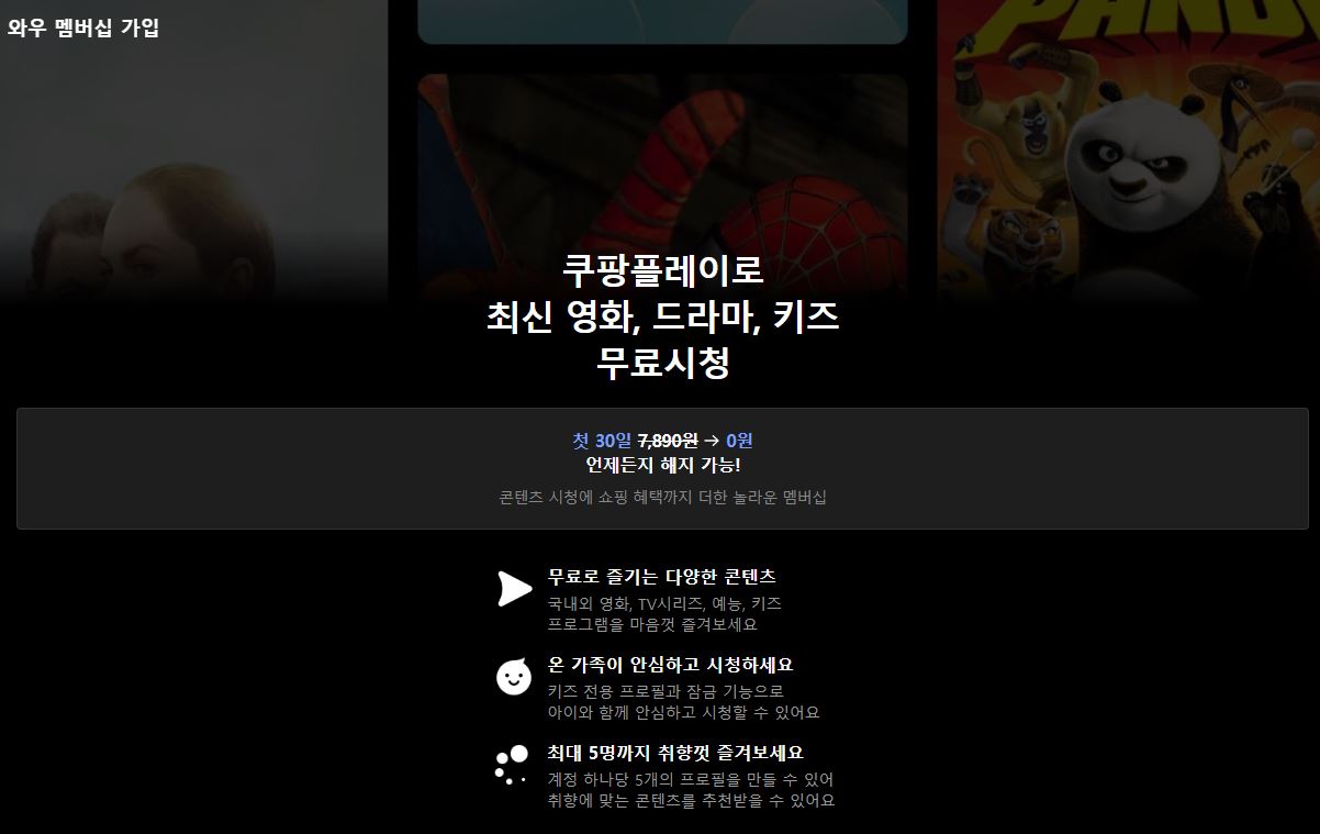 | 쿠팡 | 7,890원 | *비디오 스트리밍 *무료 배송 서비스(로켓, 로켓 프레시, 새벽, 당일, 로켓 직구) *무료 반품 *무료 쿠팡 이츠 배달비 *쿠팡 와우 전용 할인가격 |