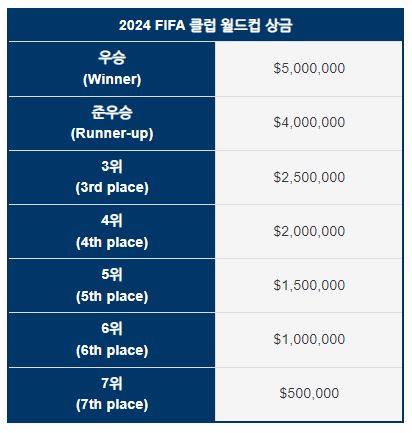 FIFA 클럽 월드컵의 상금 내역도 알아보겠습니다. 먼저 우승 팀은 5백만 불($5,000,000), 준우승 팀은 4백만 불($4,000,000)입니다. 한화로 환산 시 대략 우승 상금은 65억, 준우승 상금은 52억 정도라고 할 수 있습니다.