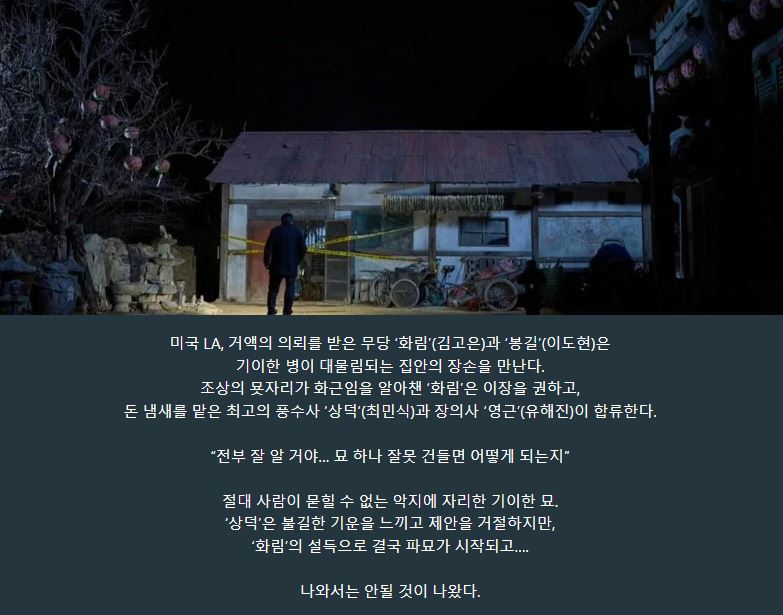 미국 LA, 거액의 의뢰를 받은 무당 ‘화림’(김고은)과 ‘봉길’(이도현)은 기이한 병이 대물림되는 집안의 장손을 만납니다. 조상의 묫자리가 화근임을 알아챈 ‘화림’은 이장을 권하고, 돈 냄새를 맡은 최고의 풍수사 ‘상덕’(최민식)과 장의사 ‘영근’(유해진)이 합류합니다. “전부 잘 알 거야… 묘 하나 잘못 건들면 어떻게 되는지” 절대 사람이 묻힐 수 없는 악지에 자리한 기이한 묘. ‘상덕’은 불길한 기운을 느끼고 제안을 거절하지만, ‘화림’의 설득으로 결국 파묘가 시작되고… 나와서는 안될 것이 나옵니다.