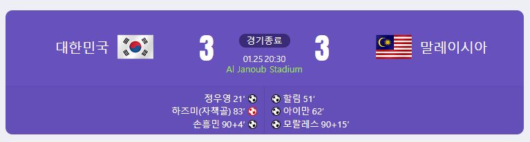 1월 25일 열린 아시안컵 조별리그의 마지막은 한국 대 말레이시아의 경기였습니다. 먼저 경기 결과를 말씀드리면 3 대 3 무승부로 승점 1점을 챙기면서 우리나라는 E조 2위로 16강에 진출하게 되었습니다. 하지만 E조 4위를 확정 지은 말레이시아를 상대로 경기 내용은 물론이고 무승부라는 결과는 만족스러운 결과는 아닌 것이 분명해 보입니다.