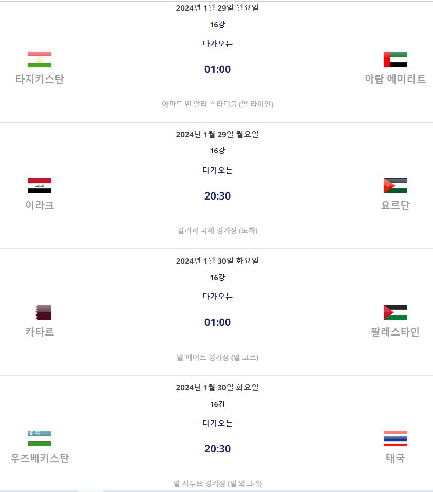 2. 아시안컵 16강 진출 국가 대진 및 일정