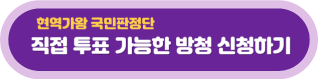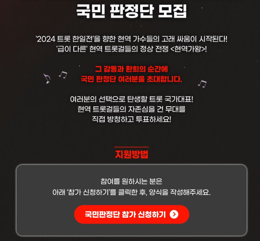 ‘현역가왕’ 홈페이지에서는 직접 방청하고 투표할 수 있는 국민 판정단 모집도 진행 중입니다. 현장에서 직접 가수들과 호흡할 수 있는 방청 기회와 내 손으로 직접 현장 투표할 수 있는 기회인 만큼 신청을 원하시는 분들은 참가 신청을 하시면 좋을 것 같습니다.