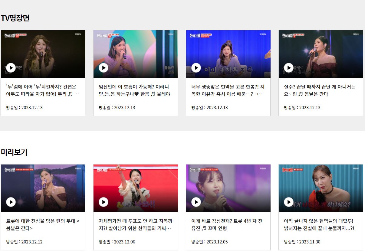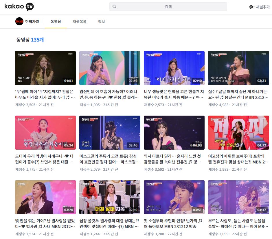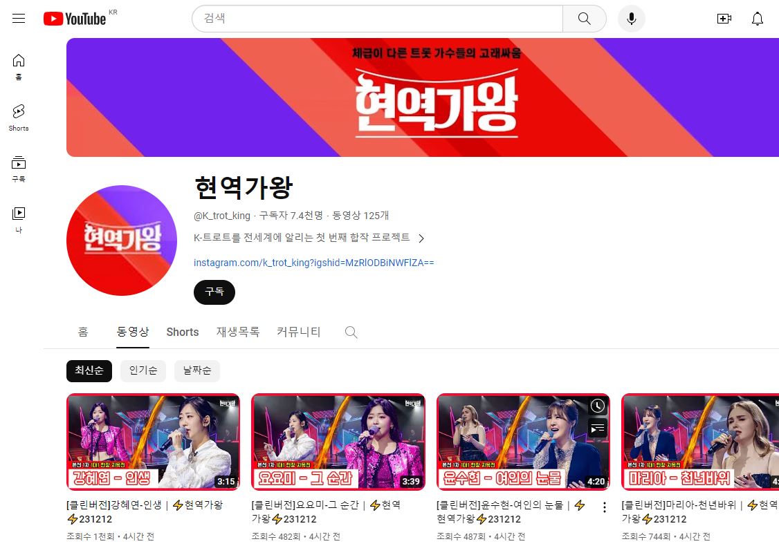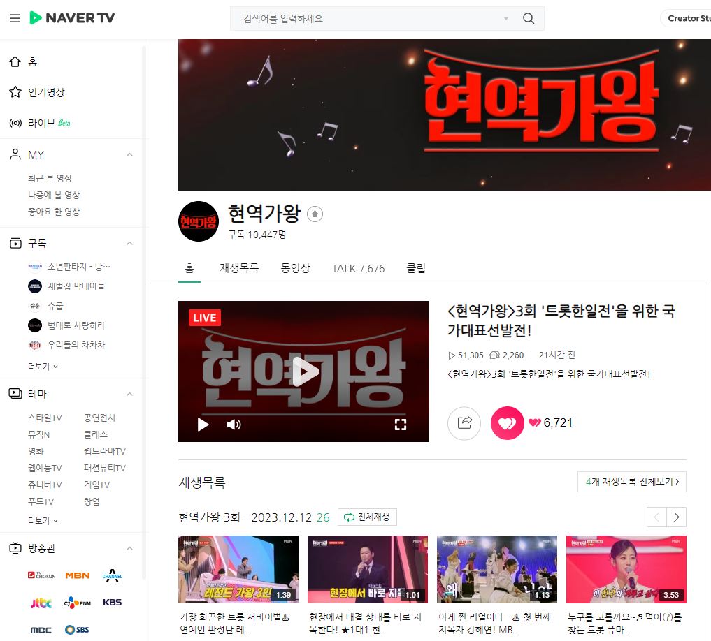 방송시간은 매주 화요일 밤 9시 40분이고 채널은 MBN입니다. 그리고 Wavve, TVING, WATCHA에서 스트리밍 서비스가 되고 있습니다. 본 방송을 못 보신 분들께서는 다시보기도 가능한데요, 네이버 TV, 카카오 TV, 그리고 현역가왕 홈페이지와 현역가왕 공식 계정 유튜브에서도 시청이 가능합니다.