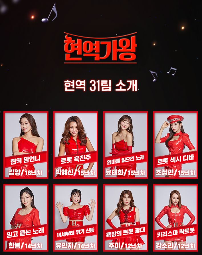 방송을 보신 분들도, 아직 보지 못하신 분들도 출연진에 대한 정보가 가장 궁금하실 것입니다. 먼저 참가자는 모두 현역 31팀으로 타이틀이 ‘현역가왕’인 만큼 이름과 함께 현역 연차를 달고 나와서 경연에 임합니다.