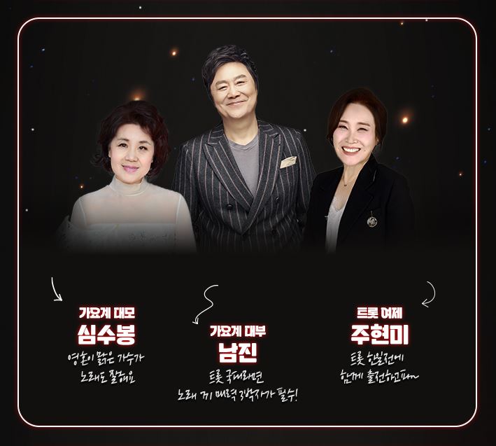 메인 MC는 국가대표 MC라고 불릴만한 신동엽 씨가 진행하는데 트롯 예능은 처음이라고 하지만 ‘불후의 명곡’을 오래 진행해 온 만큼 재미있고 자연스러운 진행 모습을 보여주고 있습니다. 심사위원석에는 가요계 대모 심수봉 씨와 가요계 대부 남진 씨 그리고 주현미 씨가 함께하고 있습니다.