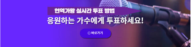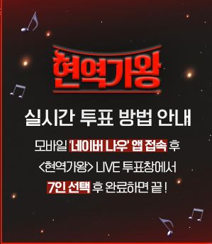 - 네이버 나우 앱 설치 ▶ 현역가왕 실시간 채팅창 왼쪽 ▶ 모래시계 ▶ 가수 7인 선택 ▶ 투표하기!!