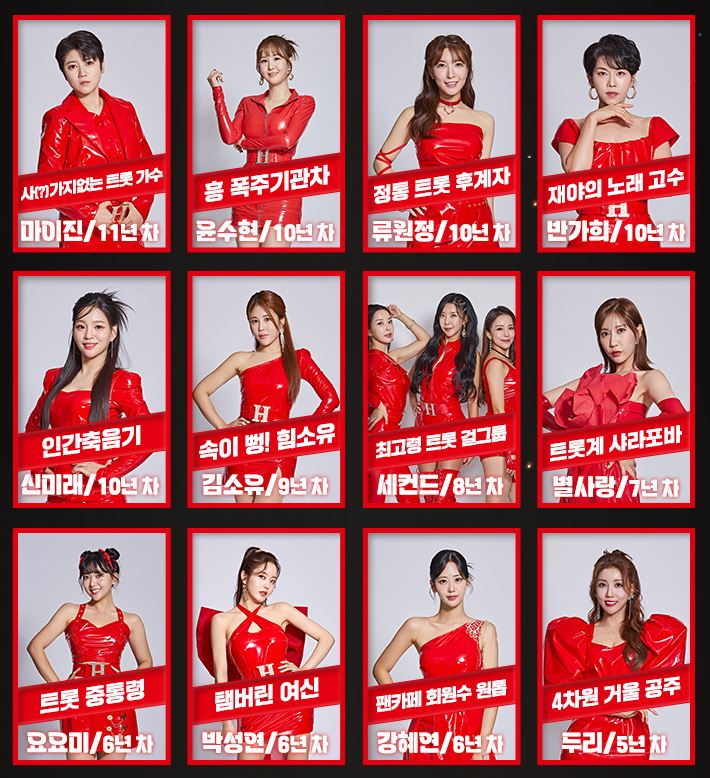 그리고 별사랑(7년차), 요요미(6년차), 박성연(6년차), 강혜연(6년차), 두리(5년차), 김나희(5년차), 전유진(4년차), 김다현(4년차), 김지현(4년차), 김산하(4년차), 장혜리(4년차), 송민경(4년차), 하이량(3년차), 마리아(1년차), 마스크걸(1년차), 린(0년차)까지 모두 31팀입니다.
