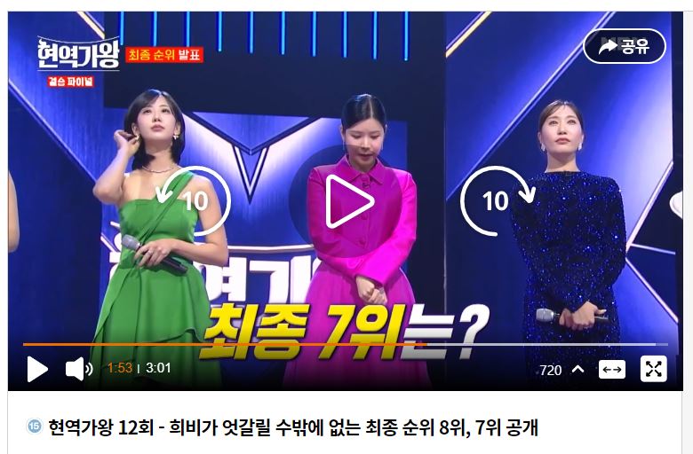 그러면 마지막 주 대결로 결정된 최종 순위와 함께 탑7 살펴보겠습니다.