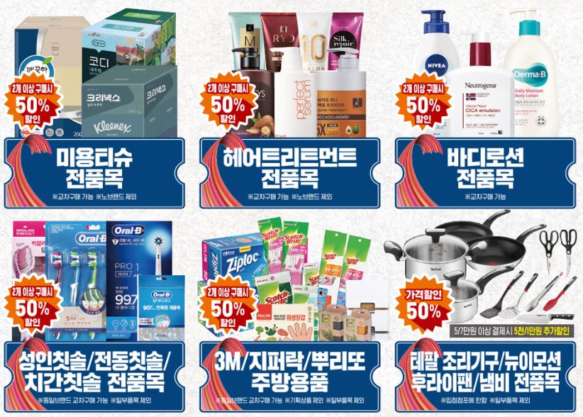 티슈류와 청소용품, 그리고 세제류는 생활 속에서 계속해서 사용하기 때문에 미리 구비해 두시는 것을 추천합니다. 그리고 치약부터 헤어 제품까지 청결용품 역시 전 품목에 진행하기 때문에 원하시는 브랜드가 있으시면 미리 정해 놓으셨다가 준비해 놓으시면 오래 잘 쓰실 수 있습니다.