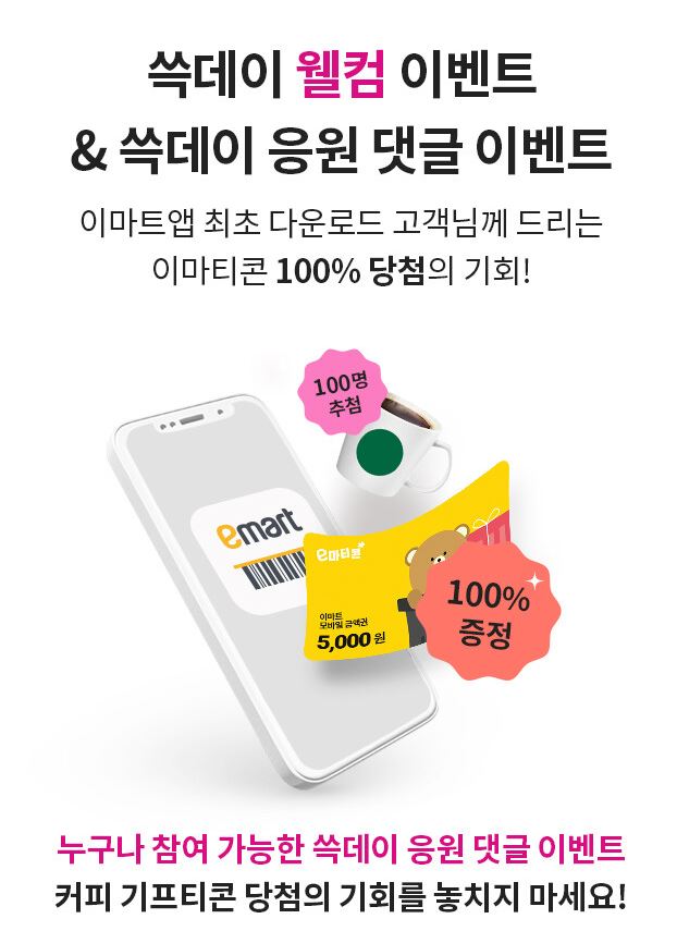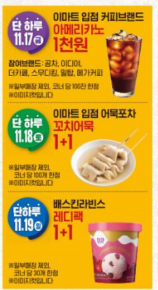 주말 아이들과 가족과 이마트 쓱데이에 가신다면 위에 제가 추천해드린 상품 살펴보시고 구매하셔서 혜택 많이 누려 보시고, 방문 시 17일은 이마트 입점 커피 브랜드에서 아메리카도 1천 원, 18일은 어묵 포차에서는 꼬치어묵 1+1, 19일은 베스킨라빈스 레디팩 1+1 행사도 있다고 하니 출출함도 달래시고 알뜰 쇼핑하시기 바랍니다.