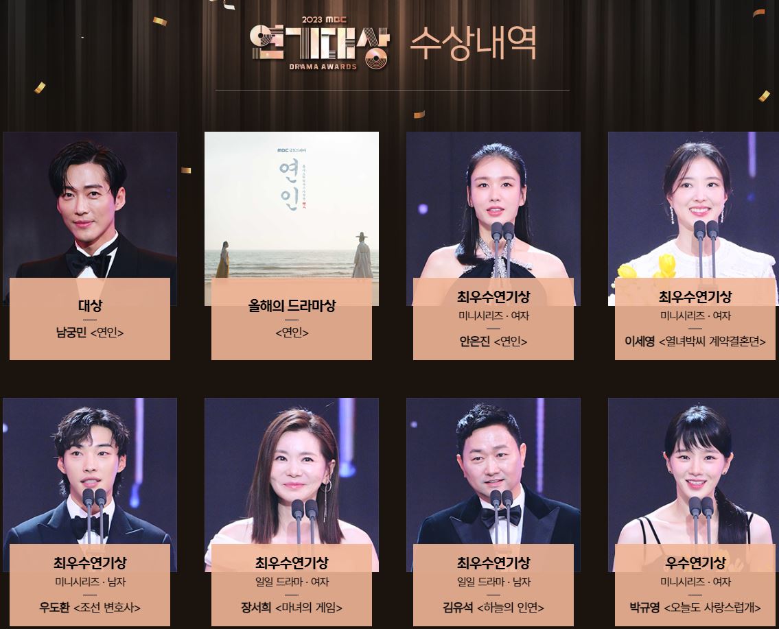 2023년 한 해 동안의 방송 3사 드라마들을 총정리 했던 연기대상 시상식은 모두 인정할 만한 분들의 대상 수상으로 크게 잡음 없이 잘 마무리되었던 것 같습니다. 수상하신 배우분들 모두 축하드리고 내년에 더 좋은 작품 만났으면 좋겠습니다.