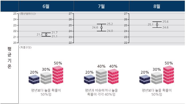 7월 | 북태평양 고기압의 영향을 차차 받겠으며, 저기압의 영향으로 흐리고 비가 오는 날이 많겠습니다. (월 평균기온) 평년(24.0~25.2℃)과 비슷하거나 높을 확률이 각각 40%입니다. (월 강수량) 평년(245.9~308.2mm)과 비슷하거나 많을 확률이 40%입니다. |