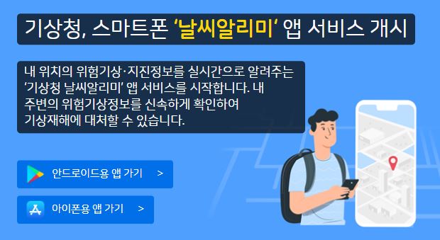 기상청에서는 실시간 '날씨 알리미' 앱 서비스를 시작했습니다. 기상청에서 직접 제공하는 날씨 알리미는 지진, 기상특보 등의 위험 기상정보를 사용자 위치 기반으로 알려주는 맞춤형 알림 서비스로, 앱 실행 시 내가 원하는 지역의 날씨 상황을 한눈에 볼 수 있고, 지진, 기상특보 등 위험기상 알림 시 알림 정보를 바로 확인할 수 있습니다.