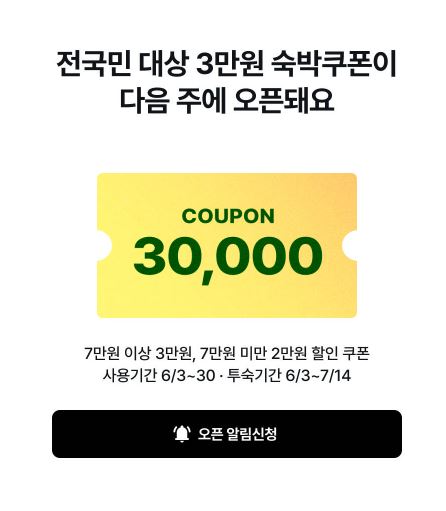 2024 대한민국 숙박세일 페스타의 할인 쿠폰은 6월 3일부터 6월 30일까지 매일 오전 10시부터 발급이 가능합니다. 지난해 참여해 보니 선착순으로 진행되는 만큼 10시를 기다렸다가 쿠폰을 발급받는 분들이 많아서 빠른 시간 내 당일 품절이 되는 경우도 비일비재했던 것 같습니다. 따라서 6월 여행지 예약을 반드시 해야 하시는 경우라면 원하시는 날 10시에 맞춰 발급받으시는 것을 추천드립니다.
