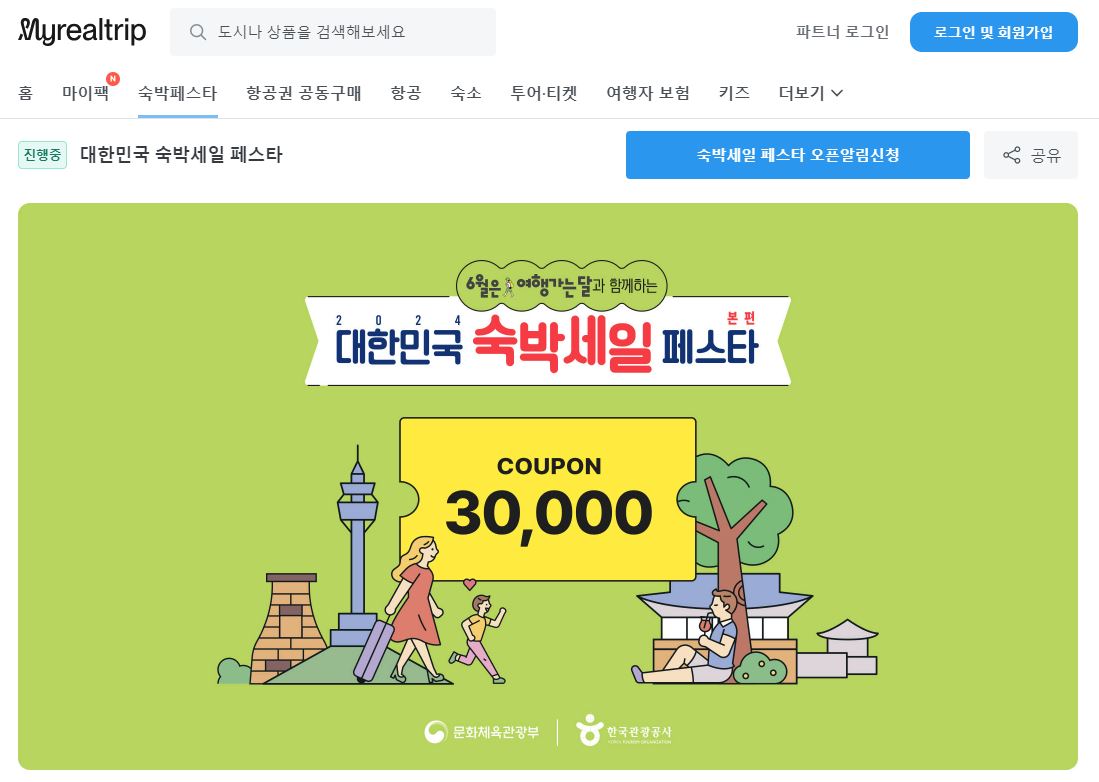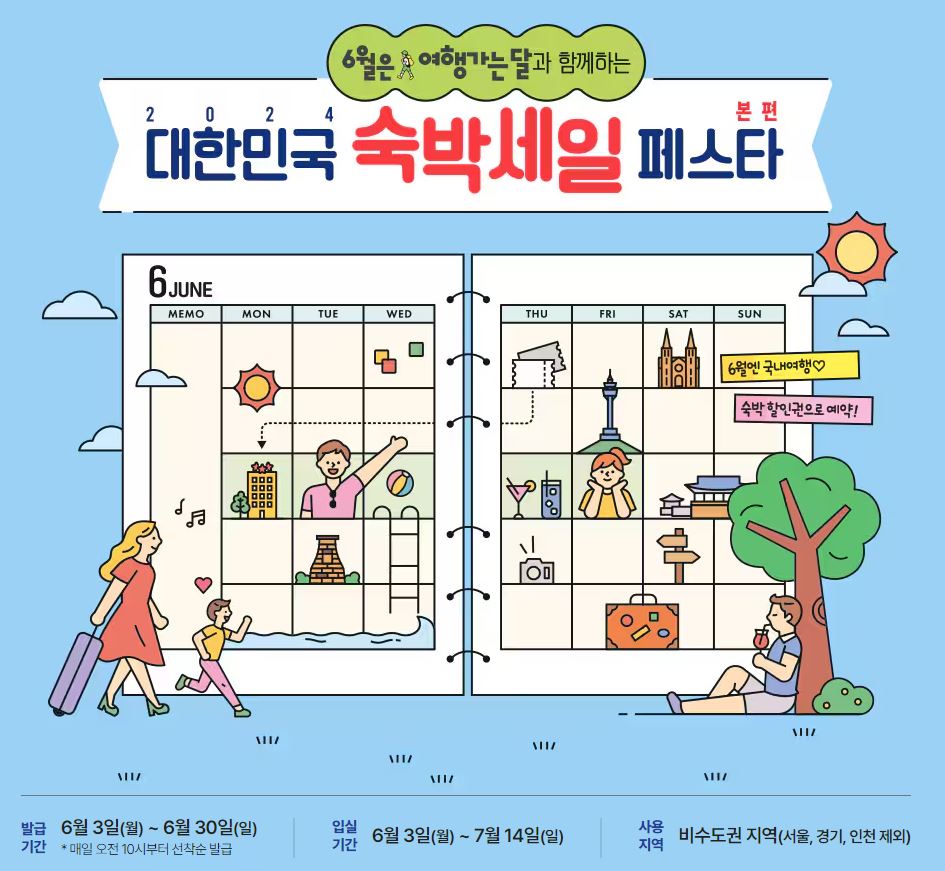 2024 대한민국 숙박세일 페스타는 문화체육관광부와 한국관광공사가 함께 국내 여행 활성화를 지원하는 행사로 오는 6월 3일부터 6월 30일까지 진행됩니다. 본편에 앞서 5월 28일부터 5월 30일까지 진행했던 지역 특별 기획전에서도 할인권을 제공했었는데요, 지역 특별기획전 숙박 할인권을 사용하신 경우에는 본편 숙박 할인권 발급이 제한되니 유의하셔야 합니다.
